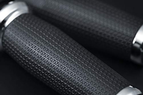 Details: The Kuryakyn 5948 chrome thresher grips this unique design is specifically made for motorcycles with 1" handlebars, has shark tooth inspired textured EPDM rubber giving you that ultra-soft, vibration-dampening comfort. Features a small diameter with subtle palm swell for a comfortable feel and ergonomically contours to the shape of your hands and measures 5" long x 1 1/2" diameter. Includes (1) Chrome clutch side grip - smaller inner diameter (1.035” ID), (1) chrome throttle side grip - larger inner diameter (1.125” ID), (2) chrome end caps, (2) tubes of adhesive; suggested tools for installation (not included): utility knife, sandpaper, electrical tape and non-permanent marker. The Kuryakyn 5948 chrome thresher grips are multi-fit for universal models with 1" diameter handlebars with open ends.