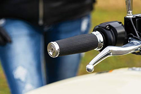 - Includes (1) Chrome clutch side grip - smaller inner diameter (1.035” ID), (1) chrome throttle side grip - larger inner diameter (1.125” ID), (2) chrome end caps, (2) tubes of adhesive; suggested tools for installation (not included): utility knife, sandpaper, electrical tape and non-permanent marker