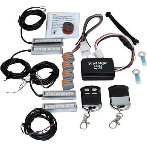 Details: You no longer have to be stuck with just one color of LED accent lights on your motorcycle. Magical Wizard lights let you switch between seven cool pre-programmed colors: red, green, blue, purple, white, teal or amber plus one of a thousand custom colors at the touch of a button. Three different strobe patterns. Three different breathe function speeds. Ability to color morph and strobe at the same time. Cannot decide what color you want? Have them all with the Color Fade feature that slowly fades from one color to the next!. Starter kit features four LED pods. Additional pods are available; sold each. Each pod contains six super-bright wide-angle LEDs. All functions are controlled by a Color Command module with 36 functions, including three strobe functions, Slow Breathe function and Color Fade function. Color Command module works up to 100 feet away. LeverLockz installation kit featuring Cage Clamp connectorsmakes installation as simple as a click. Each Cage Clamp can connect 1-15 wires together; so you can connect up to 15 pods with no soldering and no special tools. Each pod comes pre-taped with 3M double-sided tape. Pod dimensions: 2 5/16in. L x 9/16in. W x 7/16in. D. Pods come with 52in. leads.