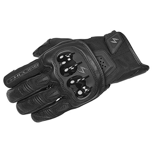 Details: A short cuff leather palmed glove with maximum ventilation for warmer weather. The palm and fingertips are all full grain leather. The gripping zones have additional Nash synthetic leather for extra grip. But the back of the hand and the area between the fingers are all durable breathable mesh. Add the hard TPU knuckle protector, padded areas on the wrist and fingers and you have decent protection in a product designed for both on road and off road use.
