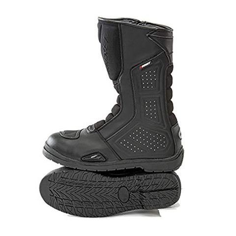 Details: The Sonic X Boots blast beyond Mach 1 with style, features and value. This technical touring boot keeps you protected with reinforced ankles, toe and heel boxes and repels water. Leather construction with reinforced textile panels Side zippered entry Water resistant with full height liner Double stitched assembly Front and back flex panels at ankle for increased mobility Internally reinforced ankle, toe and heel TPR rubber gear shift protector at toe Non-slip sole Reflective Joe Rocket logo at heel